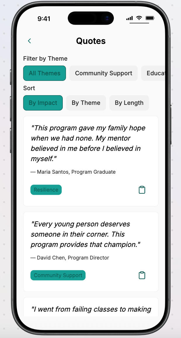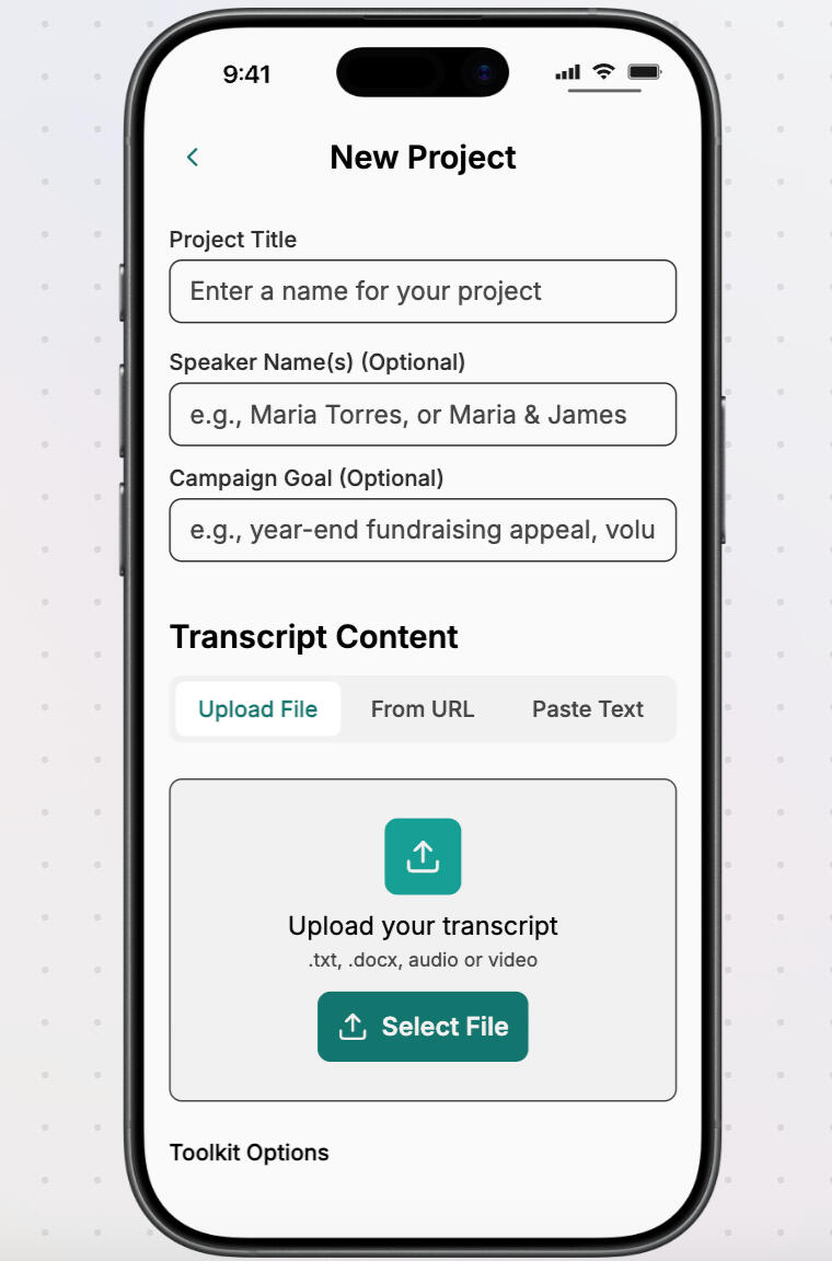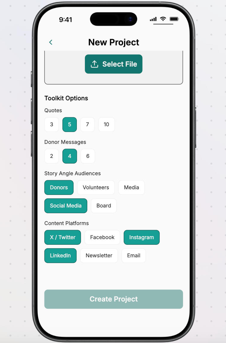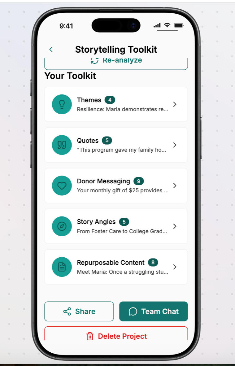 Step 3 - Generate a Story Tool KitReceive a structured, custom story kit including narrative themes, compelling quotes, story angles, donor messaging, and ready-to-use content for newsletters, social media, and fundraising.