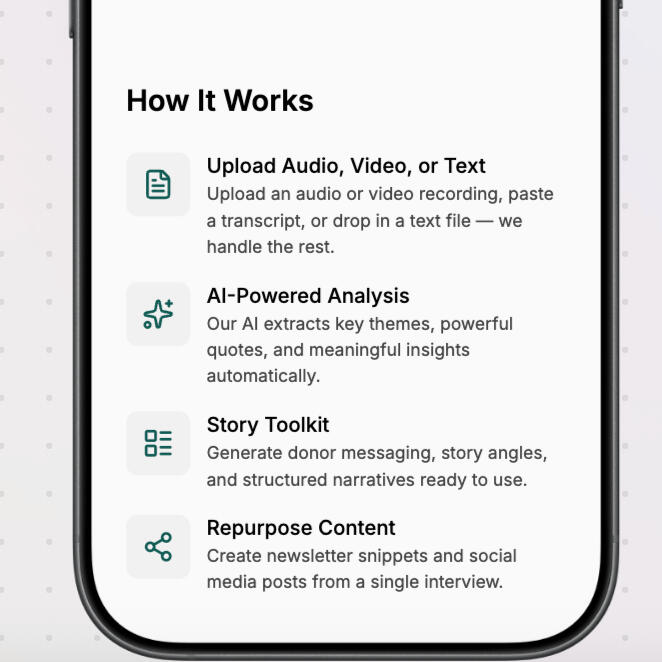 Every mission-driven organization creates powerful stories through its daily work.But most teams are sitting on hours of interviews, event recordings, and conversations they don’t have time to turn into compelling narratives.Mission Story Lab uses narrative intelligence to analyze interviews, transcripts, and conversations, helping nonprofits uncover the moments, themes, and voices that communicate real impact for your communications. Turn raw conversations into ready-to-use stories for fundraising, marketing, and impact reporting.